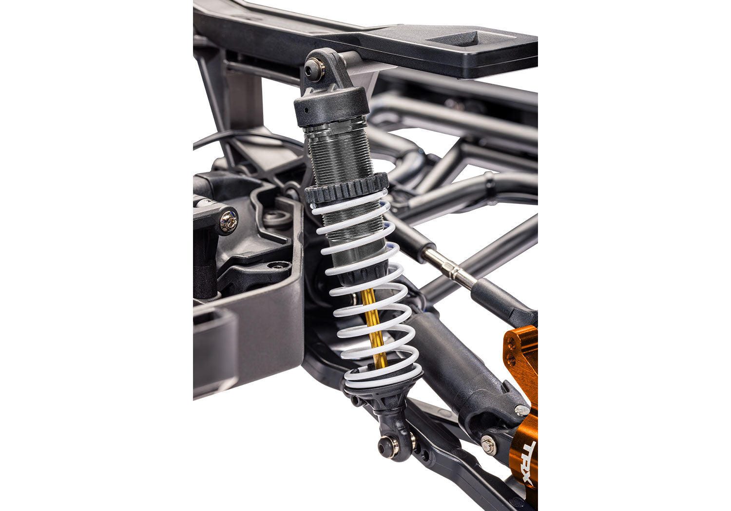 Whether you're blasting through sand dunes or clearing huge triples at the local track, the Raptor R Ultimate delivers laser-precise handling. The included TQi radio features a factory-installed Wireless Module to unlock real-time telemetry right on your smartphone, while Traxxas Stability Management (TSM) works flawlessly behind the scenes to keep the truck tracking straight during full-throttle hole shots. Add in the ultra-tough clipless body with functional LED lighting, and you have a nearly indestructible rig with jaw-dropping authentic looks.