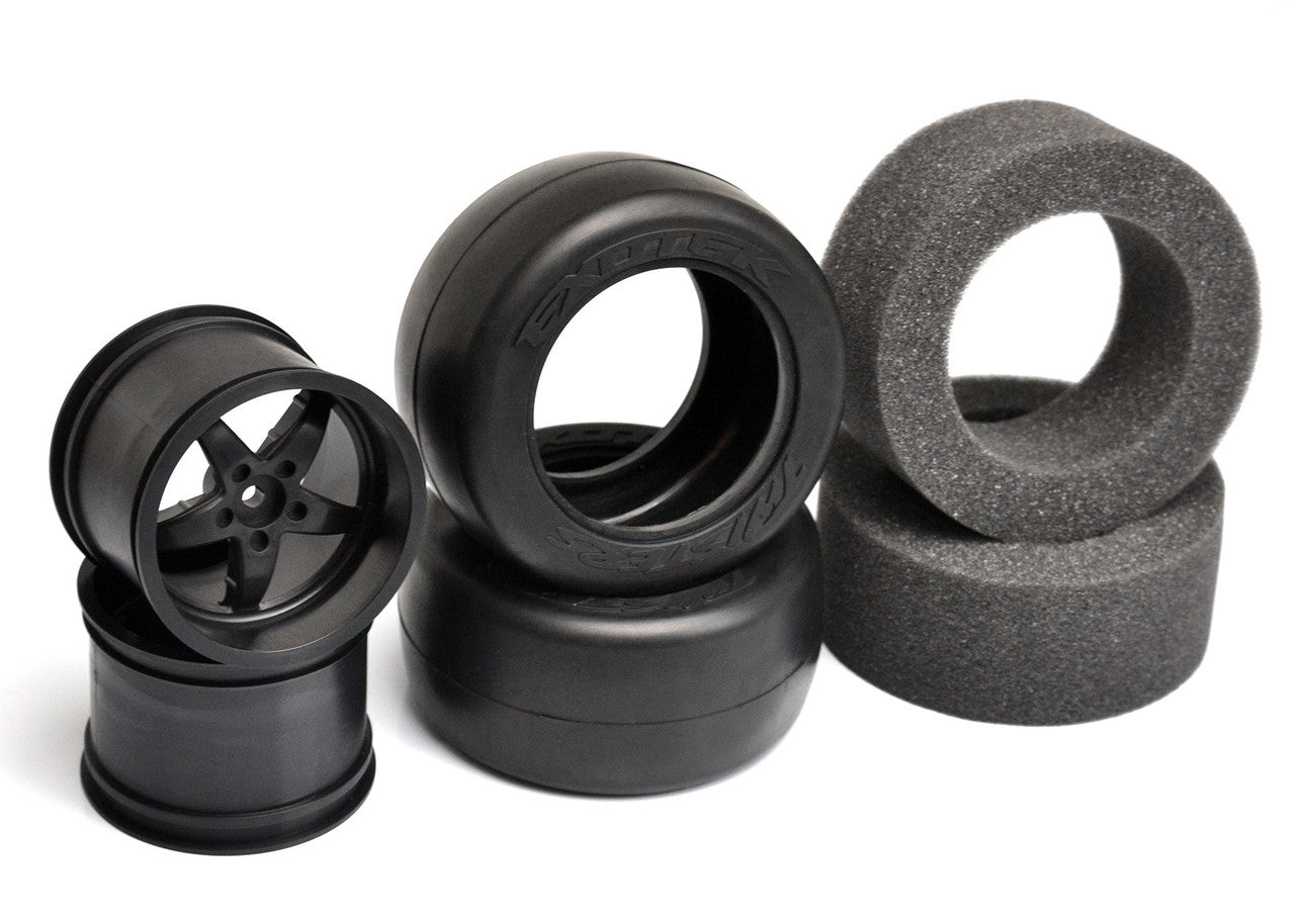 Includes 1 pair of belted rubber drag tires with nylon wheels and firm foam inserts.
