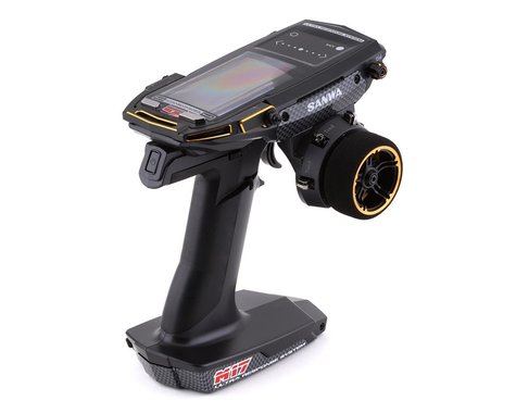 This is the Sanwa Limited Edition M17 FH5 4-Channel 2.4GHz Radio System, with included RX-493 Receiver. The M17 is the next flagship transmitter for Sanwa and boasts a color display, touch pad and FH5 Technology, all with an updated lightweight and compact design. This limited edition model features carbon fiber graphics, gold and black anodized steering wheel, gold and black anodized dial and gold and black anodized handle.