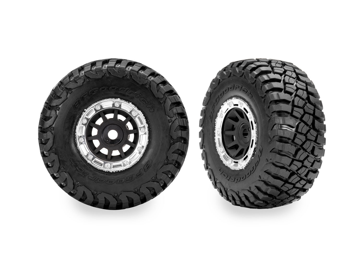 Licensed BFGoodrich® Mud-Terrain™ T/A® KM3 tires are accurate down to the smallest detail with an authentic beadlock pattern and raised sidewall lettering. The medium-compound rubber offers the perfect combination of grip, treadwear, and multi-terrain traction. The tires come mounted to dual-profile gray wheels with chrome beadlock trim for quick and easy installation. Sold as a pair.