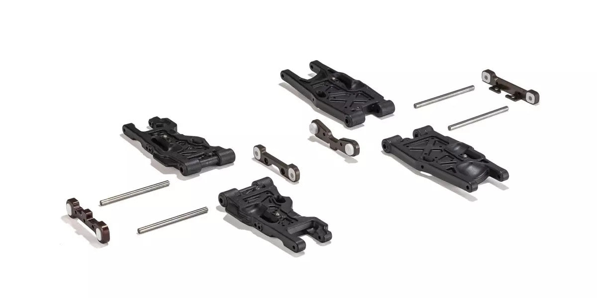 New front and rear lower suspension arms support optional carbon plates for adjustable rigidity, adapting easily to varying surface grip levels. Updated droop screws reduce chassis friction for improved chassis wear. High-rigidity aluminum lower suspension shaft holders are used to withstand the intense loads of off-road driving. The suspension shafts are mounted via precision resin bushings, which can be interchanged to fine-tune toe angle and roll center geometry.
