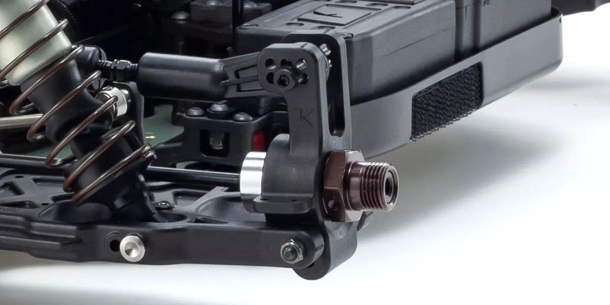 The aluminum front hub carriers feature a 12° kingpin angle which is increased from the previous MP10 TKI3 model and has 18° caster angle. This enhancement improves high-speed stability and boosts overall drivability.