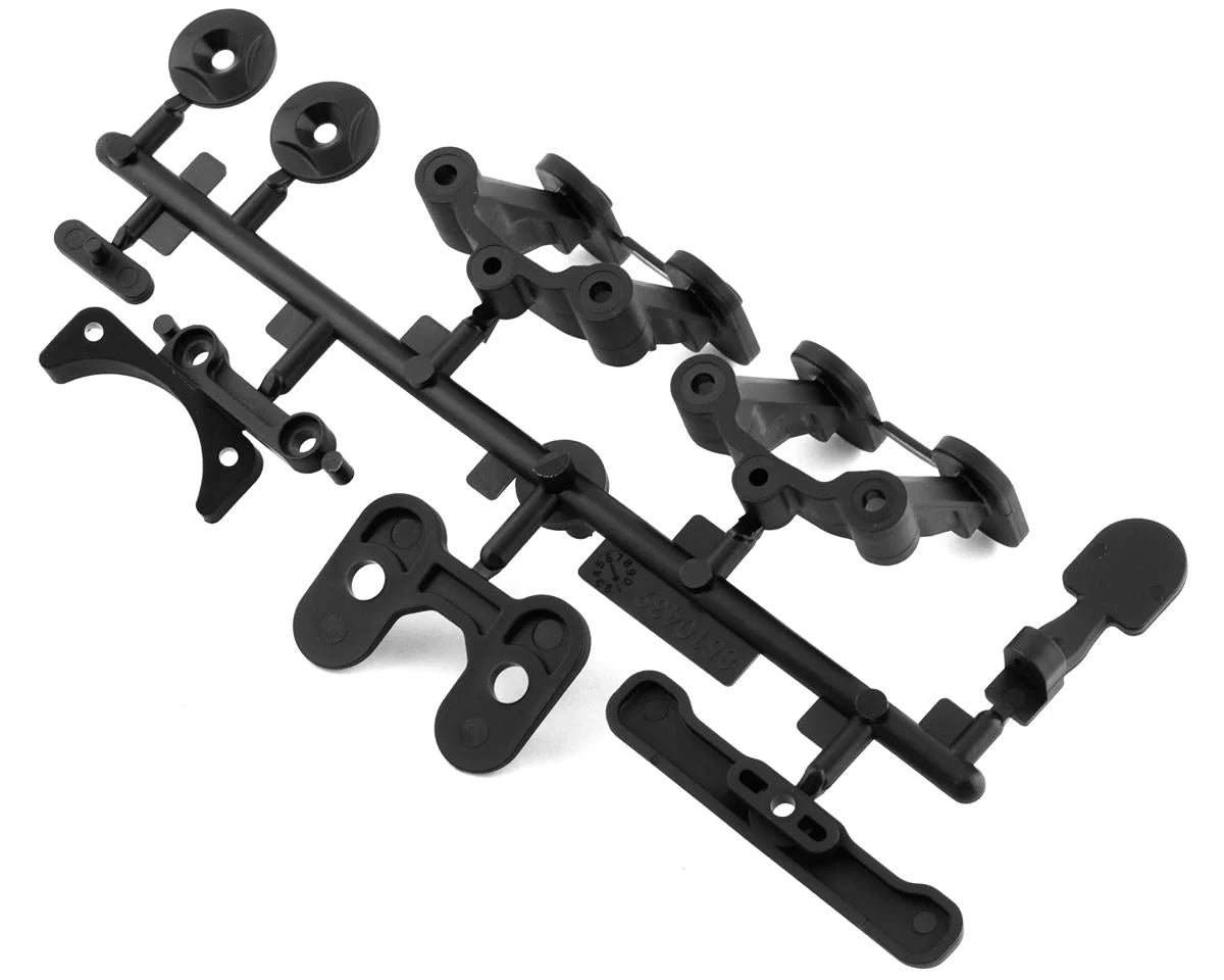 Team Associated RC10B74.2 Rear Body, Wing and Fan Mounts with Rear Bumper. These are replacements intended for the RC10B74.2 and B74.2D series of vehicles. Package includes one rear body mount, two wing mounts, one wing spacer, two wing washers, one fan mount and one rear bumper.